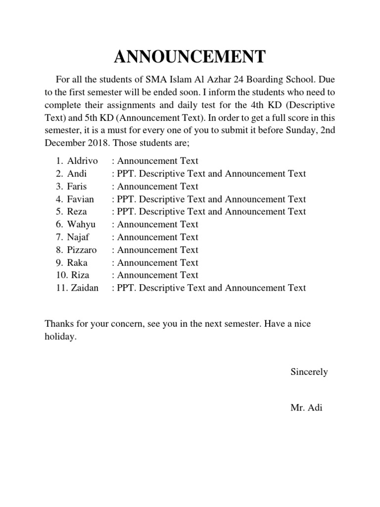 Lesson ini membahas apa itu announcement, contoh announcement, dan fun. Create the announcement or item and type in the text that you want. Teks ini harus singkat dan dapat menjelaskan apa, kapan, dimana, dan siapa. Premium document designs for creating professional announcements. Lesson ini membahas tentang salah satu jenis short functional text yaitu announcement. We will be duscussing customer complaints. Updating the users about improvements and fixes is a great way of showing that you keep developing your product to satisfy the customers. Jenis teks pengumuman ini bergandeng erat dengan jenis invitation text atau undangan. Definition of announcement announcement is one of the short functional text. You'll like what you see! There will be a meeting on 7th february 2013 at 1 p.m. The definition of announcement relating to learning english functional text is an official notification about something. Just click or highlight the text you want to edit and type away your announcement.